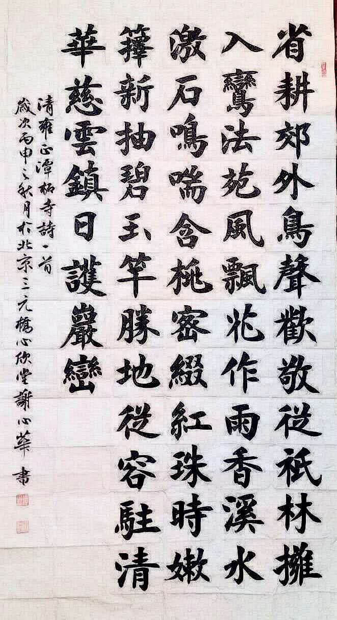 谢心华,男,字祺祯,斋号心欣堂,家传中医。1981年12月生于山东省蓬莱市。曾进修于中国书法家协会书法培训中心,2013年3月进入清华大学美术学院全国美术理论研究与书画创作高级研修班苗培红书法艺术专项研修班第2期深造。