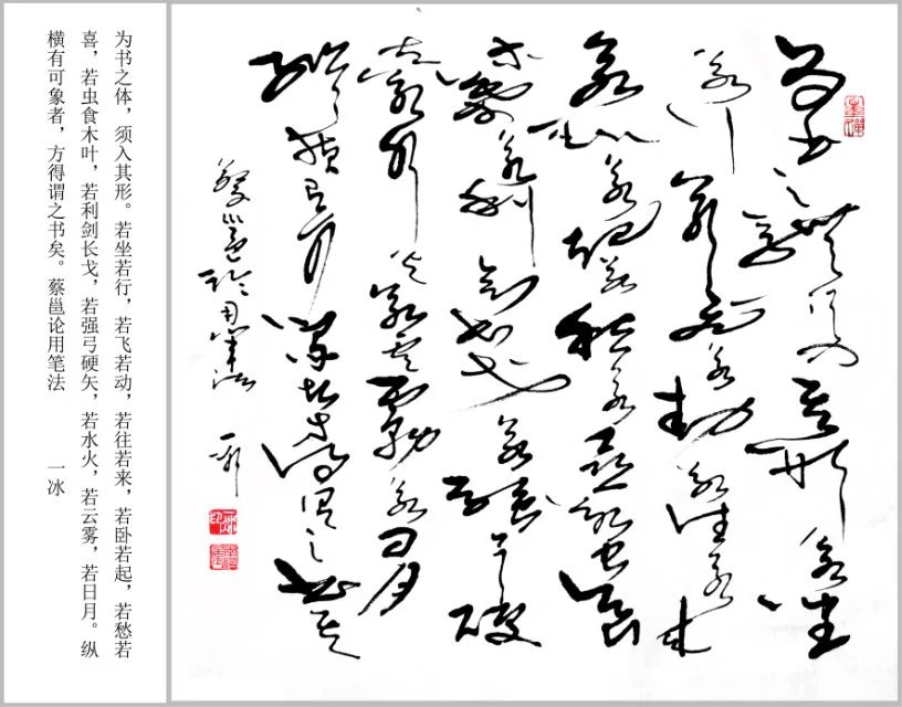 大狂草书体的形和势,是一个问题的两个面。任何形都带势,任何势都有形。孙子曰“称胜者之战民也,若决积水于千仞之溪者,形也”;“善战人之势,如转圆石于千仞之山者,势也”。书法和孙子描述的自然界产生的形势景象是一致的。善书之形,亦如积水从千仞高山冲决而出,势来不可止;善书之势,亦象圆石从千仞高山之上滚下去,势去不可遏!