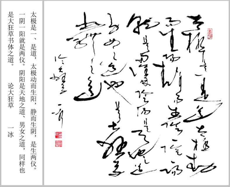 太极是一、是道,太极动而生阳,静而生阴,是生两仪。一阴一阳就是两仪。阴阳是天地之道、男女之道,同样也是大狂草书体之道。