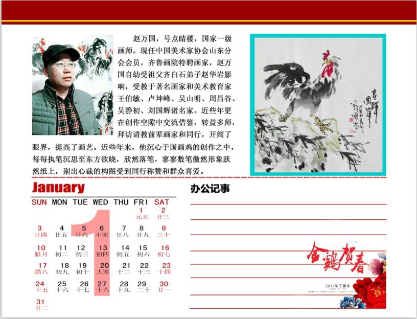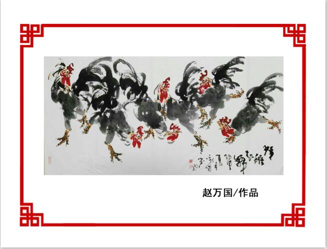 赵万国,号点睛楼,国家一级画师,幼得祖父齐白石弟子赵华岩先生真传,曾多次得到国画大师陈大羽先生指点,在大写意花鸟画的创作中独树一帜。现任中国美术家协会山东分会会员,齐鲁画院特聘画家,赵万国自幼受祖父齐白石弟子赵华岩影响,受教于著名画家和美术教育家王伯敏、卢坤峰、吴山明、周昌谷、吴静初、刘国辉诸名家。在浙期间受上辈艺术大师潘天寿、林风眠、诸乐三等人遗泽滋养,奠定了其坚实的艺术功力,深得浙派画风神韵,进而在实践中逐步形成了鲜明的个人风格。近些年更在创作空隙中交流借鉴,转益多师,拜访请教前辈画家和同行,开阔了眼界,提高了画艺。赵万国先生多年来潜心钻研,成绩斐然,在人物、花鸟、山水诸领域多有建树,其画作常发表于报刊杂志。近些年来,他沉心于国画鸡的创作之中,每每执笔沉思至东方欲晓,欣然落笔,寥寥数笔傲然形象跃然纸上,雅俗共赏的立意、夸张灵动的形象、流利干净的线条、别出心裁的构图受到同行称赞和群众喜爱。