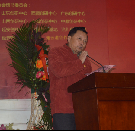 中国社会艺术协会榜书委员会会长苗小龙讲话。他说,我们榜书委员会成立以来,在中国社会艺术协会的正确领导下,认真学习贯彻习近平总书记在全国文艺工作座谈会上的讲话精神,始终坚持服务为民的创作导向,大力弘扬榜书艺术。特别是我们积极响应习总书记关于大力加强红色教育,弘扬“四种伟大精神”的号召,先后在南昌、延安、西柏坡等地,以及八路军总部中原指挥所、新四军军部、沂蒙山区等地,开展了一系列的红色文化交流活动。通过这些活动,我们回顾历史,也启迪思想。我们深刻地感到,中国革命的成功和胜利非常不容易,共产党、毛主席非常伟大,革命先烈和老一辈革命家非常的可敬可爱,习总书记提出的“不忘初心、继续前进”的思想意义非常深刻且重大。在这个基础上,我们组织这次以榜书为重点,以“中国梦”为主题的大展,目的是以榜书的魅力鼓励广大书法爱好者和广大人民群众,为实现“两个一百年”的奋斗目标,为实现伟大复兴的中国梦而努力奋斗。张百成大师是我们榜书委员会的奠基人和中国榜书事业的传承者、开拓者,他呕心沥血、鞠躬尽瘁、死而后已,为榜书事业发展做出巨大贡献,建立了不朽的功勋,今天是对他最好的纪念,他永远鼓舞我们前进。不久以前中国共产党第十八届六中全会决定了以习近平为党中央的领导核心,我们榜书委员会一定要紧跟形势,紧跟大势,用榜书艺术讴歌伟大时代,为我们党和国家服务,为广大人民服务,为实现“中国梦”做出更大的贡献。