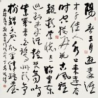 申万胜于诸体中最擅长行草。与时下书风截然不同的是,他的行草作品执意追求重、拙、大的浑厚之美,以博大沉雄的力感来感染观众,并从中体现书家作为军人对“壮美”这一审美理想的追求。其书风碑帖融合,气格旷达,沉雄洒脱中寓凝重、老辣、生涩,无论结体与线条,均不主故常、不假修饰而一任自然。同时他注重线条、墨色的丰富变化和结字的腾挪避就,注重点画的纵横结合,注重情感和性灵的流露,从而使作品具有强烈的视觉张力和时代精神。其落笔作书之际,横竖波磔,圆中寓方,枯润相间,轻隽求挺而不失之野,爽然求润而不失之媚,时而苍雄若古,时而沉着华滋。其书无论是巨制佳构还是尺短小品,字里行间处处充溢着直率、朴厚、开张的气象,散发着浓浓的文人气息。其书风形成除悟性与功力因素外,还来自于秉性与取法,用他自己的话说,这是一个在长期求索中发现自我、把握自我的过程。