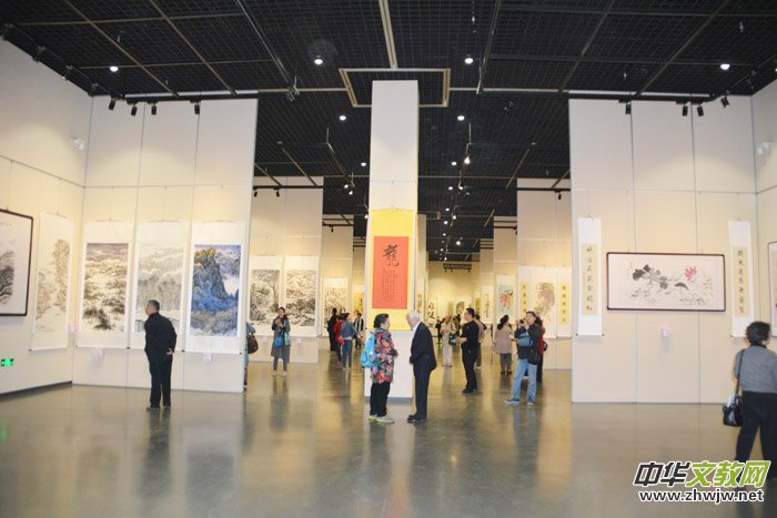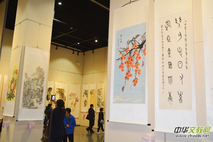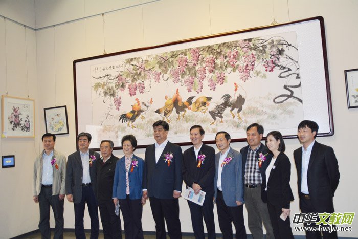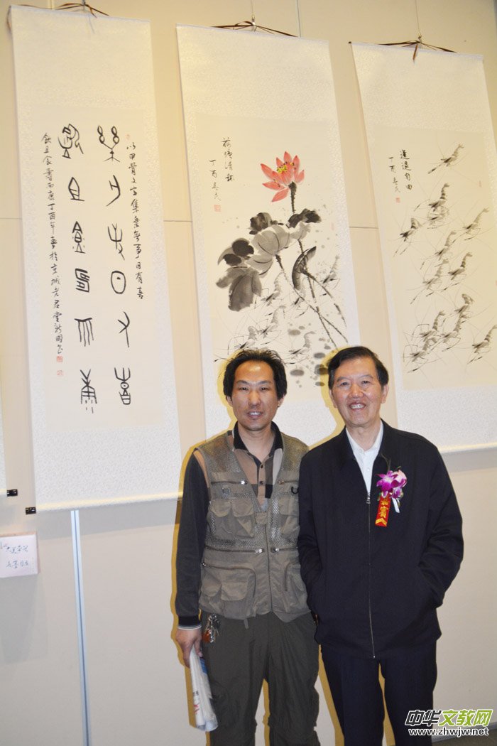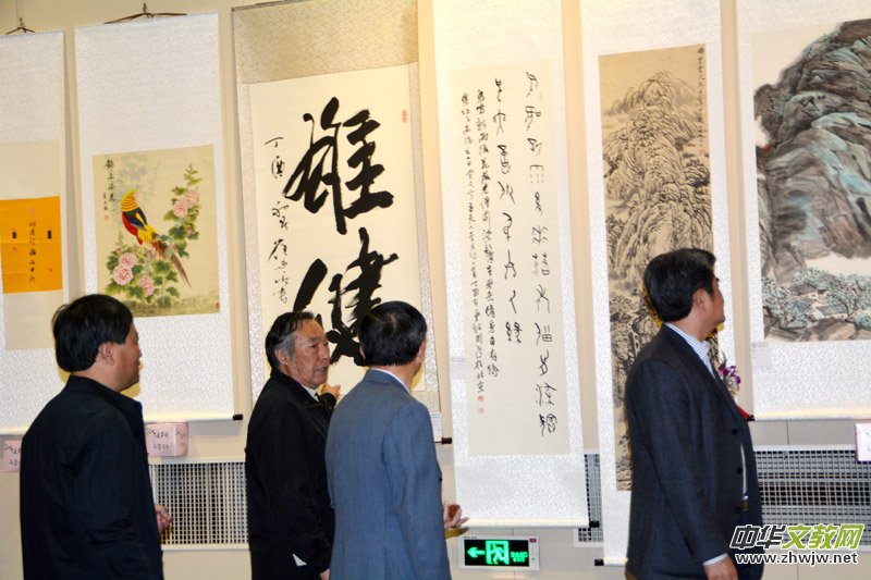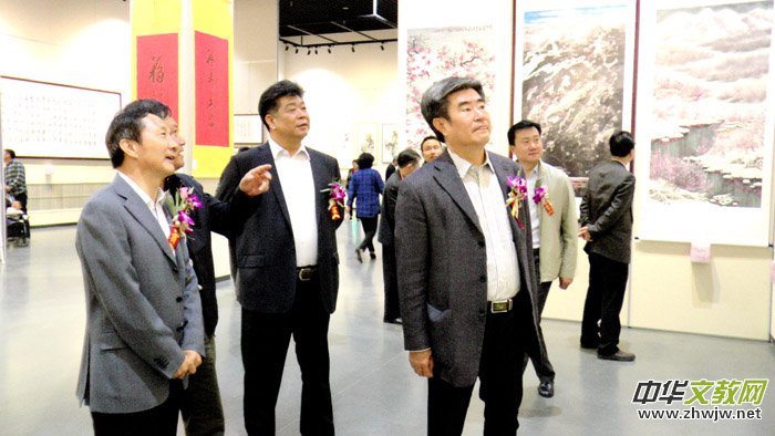 近千平方米的展厅里,中科院文联主席郭曰方书法作品《平谷春雪》;当代中国著名小写意花鸟画家金默如的《牡丹》;当代山水画名师佟景森的作品《轻舟已过万重山》;当代画坛有“黄胄的驴,晋庸的鱼”之说的著名画家冯晋庸的作品《祥和太平》;海军政治部创作室创作员甘长霖的《牡丹》;军旅画家、一级美术师张福盈的《果香紫韵》;中科院书协主席崔承顺的作品;原重庆市副市长鲁善昭的《秋韵》;山水画家、中国名家书画院副院长史贵仁的巨幅画作《大美山河》;中科院博士生导师辛希孟的巨幅书法行楷《沁园春·雪》;冰雪山水画家赵春秋的《深秋暮雪》;本网总编、中国甲骨文书法艺术研究会理事靳新国(笑琰)的甲骨文书法等、中国书协、美协大家也有作品参展,引得参观者驻足连连。现场最为震撼的是,中科院美协主席、平谷本地画家周春民特意为此次书画展创作的巨幅画作《荷塘春色》、《多子多福吉祥如意》,作品大气磅礴,吸引诸多书画爱好者在前拍照品鉴。 中科院美协主席、北京桃花川书画院院长周春民(左二)在给观展领导嘉宾介绍参展作品。 今年的画展不仅吸引了众多中科院院士、全国各地书画大师、退休干部前来参展,并且特别开设了周庄子村专属展区,专门展览周庄子村书画大师、村民和学生的作品20余幅。 书画大师们通过作品"写平谷、画桃花,宣传平谷,宣传桃文化"。参展观众享受完一幅幅展现平谷"书画桃花"带来的视觉冲击后,还感受到了平谷的"山水之美,桃花之醉",产生游览平谷山水桃花美景的冲动。 书画正在成为大兴庄镇的一张文化名片,吸引着全国各地众多书画爱好者聚集大兴庄。大兴庄正在以周庄子村为核心建设文化创意产业园区,用以培育全区喜爱美术事业的人才,带动、提高全区人民的文化水准,为全国美术大家提供更好的活动场所,为艺术家提供创作和交流的空间,可在园区内举办各种展览、笔会及大奖赛等活动,同时可利用项目衍生带动作用,加快村庄建设和百姓发家致富。 本网总编靳新国(笑琰)和中国科学院文联主席郭曰方先生在活动上合影。